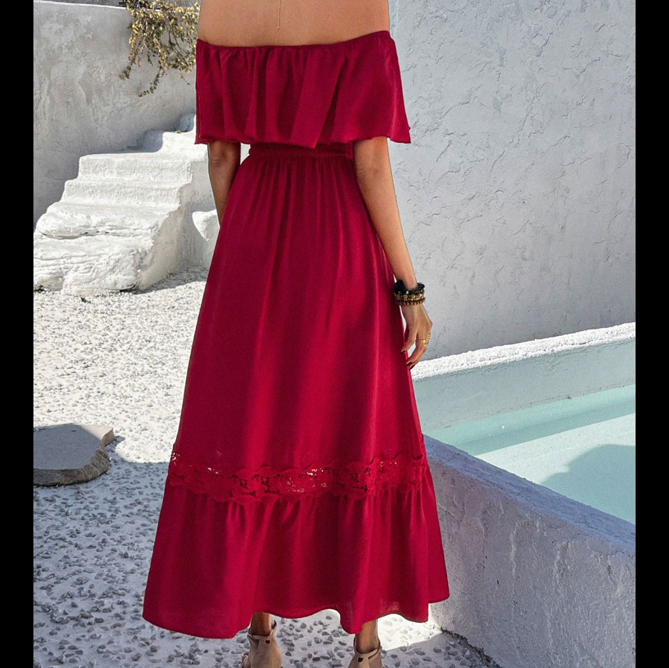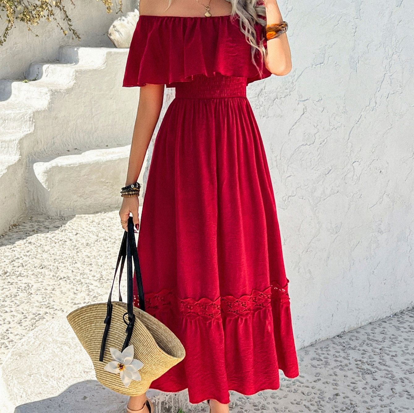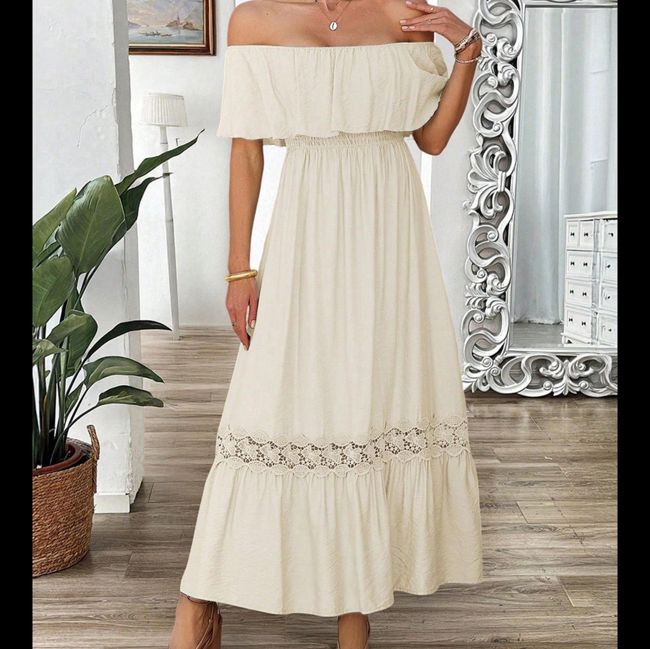 肩を美しく見せるオフショルダーデザインが魅力的なワンピースです。