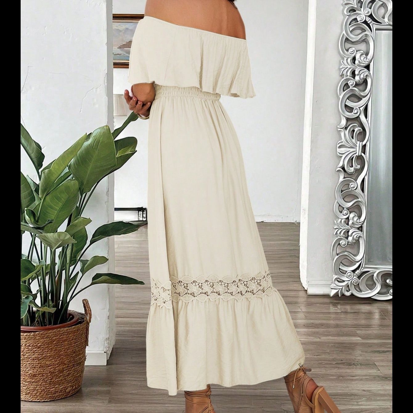 胸元のたっぷりとしたフリルが女性らしさを演出し、リゾートや夏のお出かけにぴったりです。