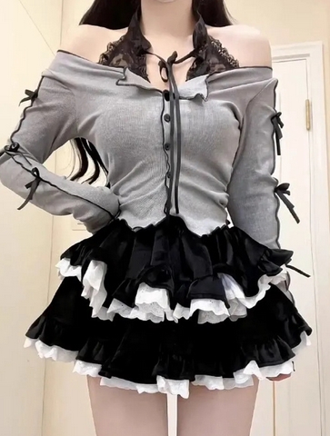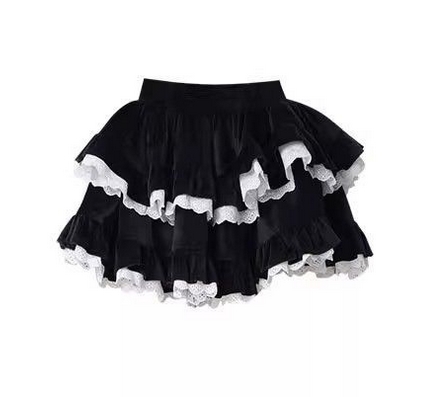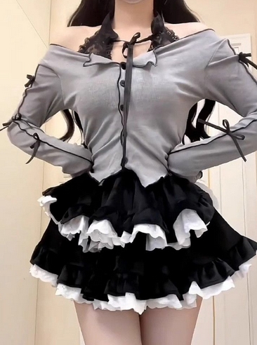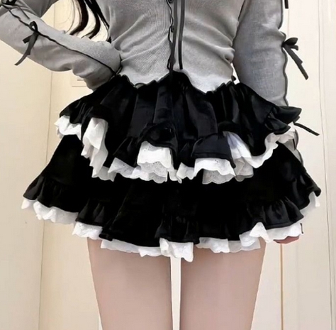 黒と白の多段フリルが特徴的で、上品で可愛らしい印象を演出します。