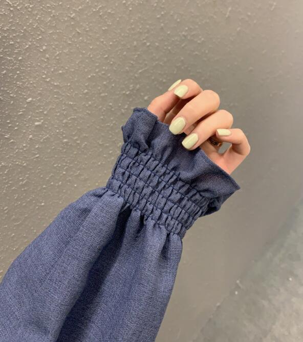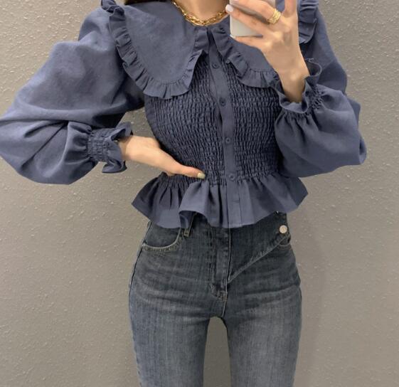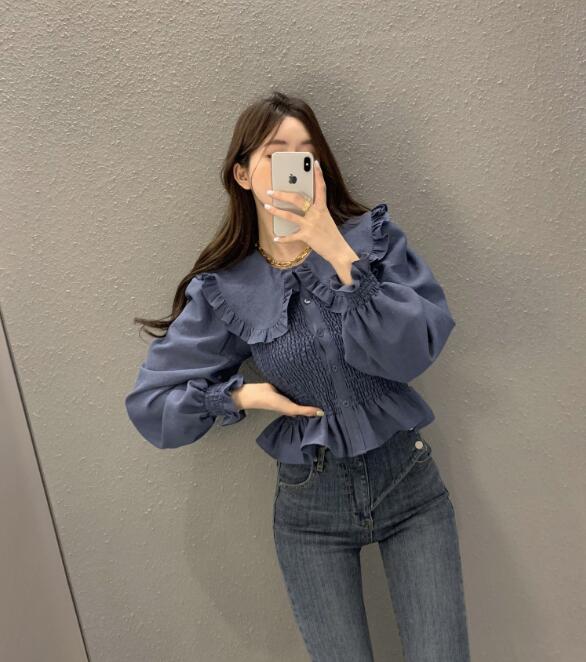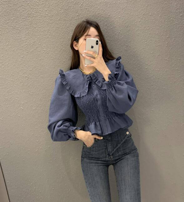 可愛らしいフリル襟が印象的なシャーリングブラウスです。